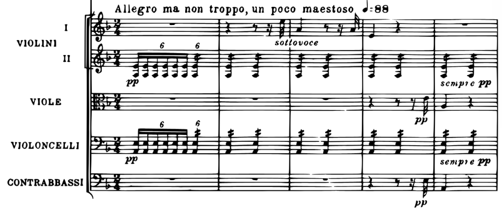 The symphony opens with a very uncommon use of open fifth, in an arpeggio containing only a perfect fifth (with no third) for a duration of sixteen bars. This gives the opening a sense of indeterminacy, of expectation, that resembles the the sound of an orchestra tuning up. The waiting is satisfied only at bar number 17, where the theme in D minor is presented.
